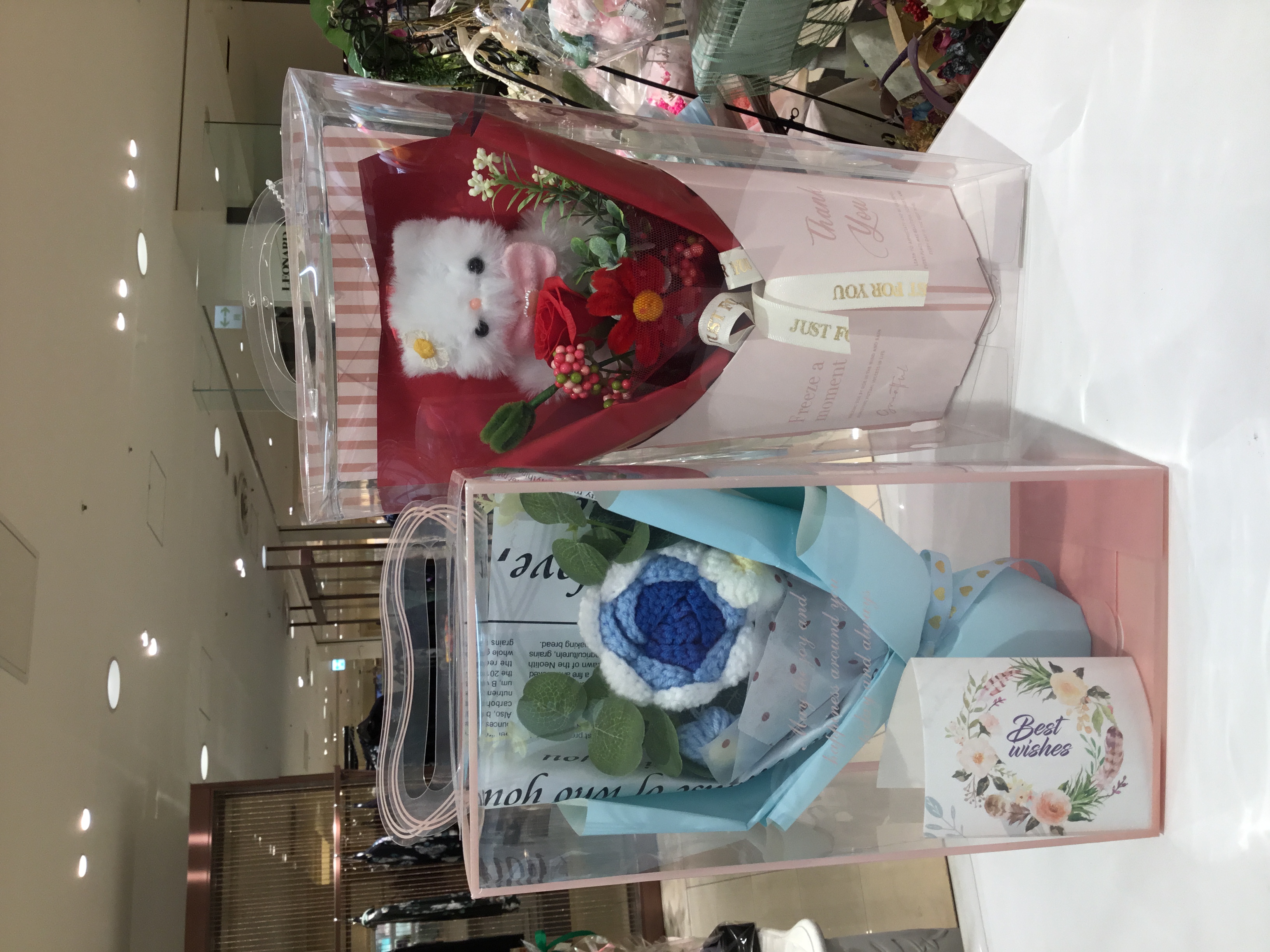 毛糸で編まれたブルーのお花と、ふわふわ猫ちゃんとモールでできた赤いお花のついたソープフラワーを販売しております♡